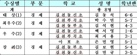 경제와 독서신문으로 분리하여 실시한 이번 공모전에서 가족경제신문 부문의 대상의 영예는 김천동신초등학교 김동석 어린이 가족에게 돌아갔으며, 가족독서신문 부문은 김천서부초등학교 문해솔 어린이 가족이 대상의 영예를 안았다.