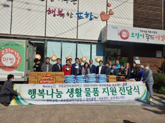 이와 함께 로타리클럽 3630지구 김상수 총재는 즉석에서 푸드마켓 이용자들의 코로나19 감염병 예방을 위해 2천장의 마스크를 전달하면서 앞으로도 저소득층을 위하여 꾸준한 지원을 하겠다고 약속했다. 포항시 푸드마켓은 기부받은 식생활용품 등을 포항시가 선정한 차상위계층, 저소득 독거노인 및 조손가정, 긴급지원 세대 등 생계에 어려움을 겪고 있는 700여 세대에 매월 2만원 상당의 식생활용품을 지원하고 있다.