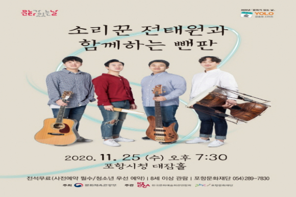 재단법인 포항문화재단은 오는 25일 오후 7시 30분 포항시청 대잠홀에서 문화가 있는 날「金YOLO(금욜로)」시리즈 <소리꾼 전태원과 함께하는 뺀판>을 개최한다.