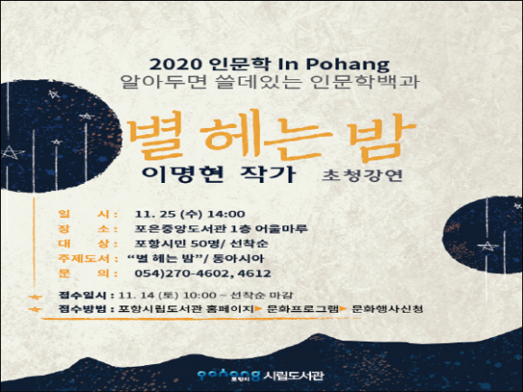 11월의 ‘인문학 In Pohang’- 이명현 작가 초청 강연
