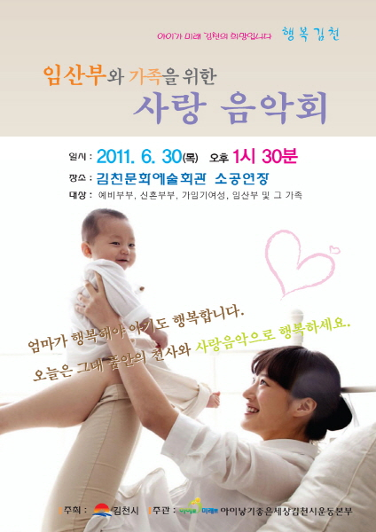 김천시에서는 많은 사람들의 관심과 축복 속에 소중한 생명을 가진 임산부와 가족을 위한 사랑음악회를 2011. 6. 30(목) 1시30분부터 문화예술회관 소공연장에서 펼친다.