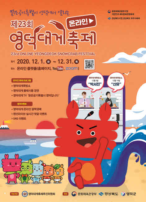 영덕대게축제추진위원회(위원장 손문구)가 주관하는 올해 축제는 온라인으로 개최되는 만큼 1달간 진행되며, 영덕대게축제 홈페이지(www.ydcf.co.kr)를 통해 다양한 참여행사가 마련됐다. 영덕군은 축제의 원활한 진행을 위해 홈페이지를 반응형 홈페이지로 개편하고, 영문판으로도 제작해 외국인들도 쉽게 이용할 수 있게 했다. 또, 글로벌 ICT 트렌드에 맞춰 축제 유튜브와 SNS를 개설해 여행 및 먹방 콘텐츠를 소개한다. 프로그램은 영덕대게 쿡방쇼를 통해 쌍방향 영덕대게 요리쇼를 진행해 영덕대게를 맛있게 즐기는 방법을 소개하고, e-메일 사연 접수를 통해 50여 팀을 선정해 영덕대게도 발송한다. LIVE 방송을 통해서는 전문 요리사가 함께 출연해 대게요리를 만드는 시간도 갖는다. 주민 참여 및 주민 주도형 프로그램도 마련됐다. 영덕대게 플래시몹 경연이 비대면 방식으로 개최되며, 온라인 축제로는 처음으로 ‘영덕대게TV' 유튜브 생방송을 통해 9개 읍·면 주민들이 직접 출연해 관광명소와 특산물을 소개하고, 직접 판매도 하는 온라인 커머스도 운영한다. 라이브 방송을 통해서 영덕대게 깜짝 경매도 진행되는데, 방송 중 ‘ZOOM’을 통해 쌍방향으로 진행되며, 경매사가 정한 경매 금액 맞추기, 실시간 댓글로 이뤄지는 경매 등이 열린다. SNS 이벤트로는 ‘내 사연 속 #해시태그’ ‘#대게적 남자’ ‘#대게품은 라방’ ‘#리멤버 영덕’ 등을 시행해 온라인으로 대게축제에 참여할 수 있게 했다.