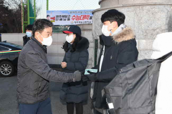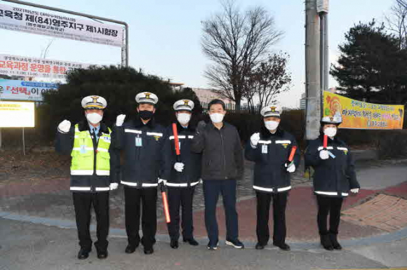 경북 영주시(시장 장욱현)는 ‘2021학년도 대학수학능력’ 시험의 원활한 진행과 수험생 편의를 위한 종합지원 대책을 추진했다. 이날 실시한 주요대책은 수험생의 안전하고 원활한 교통 소통을 위해 시험장 주변 교통 통제 및 주차지도, 영어 듣기 시험 중 시험장 주변 공사 작업 중지, 응급상황 발생에 대비한 응급의료반 대기, 거리질서 계도 등을 실시했으며, ‘코로나19’ 확산 방지를 위해 마스크 착용, 발열체크 등 방역수칙을 철저히 준수하며 진행됐다. 올해는 ‘코로나19’로 인해 수험생을 위한 단체 응원 및 음료 제공은 추진하지 못했다. 이날 ‘2021학년도 대학수학능력시험’은 영주지역에서 영주제일고, 영주여고 등 6곳의 시험장에서 934명의 수험생이 시험을 응시했다.