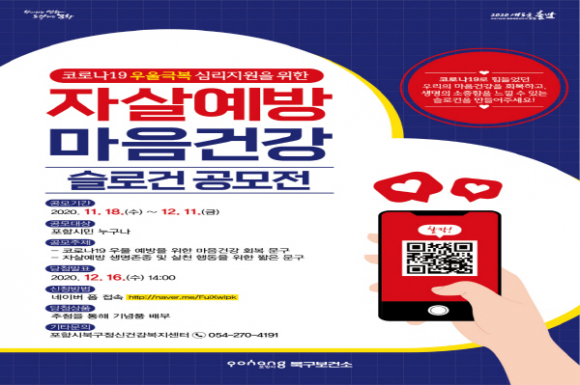 포항시 북구보건소 정신건강복지센터는 오는 11일까지 ‘2020년 자살예방 마음건강 슬로건 공모전’을 개최한다.
