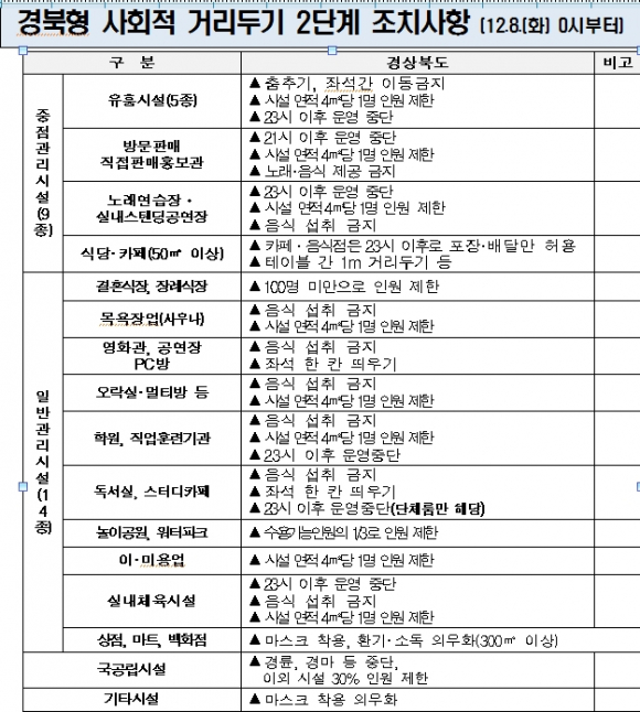 12월 28일 24시까지 사회적 거리두기 2단계 시행 모임·행사 100인 이상 집함금지, 상점·마트·백화점(300㎡ 이상)은 마스크 착용, 환기·소독 의무화 등