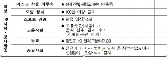 결혼식장과 장례식장은 100명 미만으로 인원이 제한되며, 영화관·공연장·PC방은 음식섭취 금지와 좌석 한 칸 띄우기, 목욕장업(사우나)·오락실·멀티방 등은 음식섭취 금지와 시설면적 4㎡당 1명으로 인원을 제한, 이·미용업은 시설면적 4㎡당 1명으로 인원 제한, 놀이공원과 워터파크는 수용가능 인원의 1/3로 인원 제한, 상점·마트·백화점(300㎡ 이상)은 마스크 착용과 환기·소독이 의무화된다.