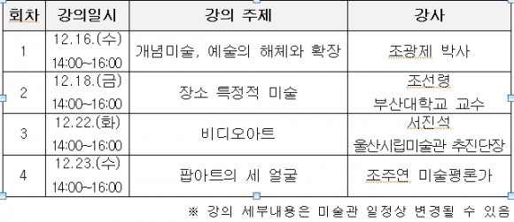 16일 오후 2시부터 철학아카데미 이사장인 조광제 철학 박사의 강연 ‘개념미술, 예술의 해체와 확장’을 시작으로 아카데미의 문을 연다. 이어서 18일 부산대학교 조선령 교수의 ‘장소 특정적 미술’, 22일 서진석 울산시립미술관 추진단장의 ‘비디오 아트’ 그리고 23일 조주연 미술평론가의 ‘팝아트의 세 얼굴’이 진행된다.