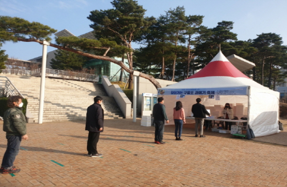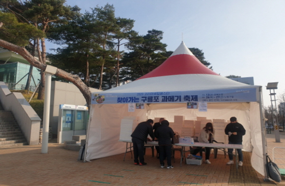 포항시는 지난 11일 포항시청 앞 광장에서 코로나19로 얼어붙은 소비자의 마음을 녹이고자, 이준영 시의원의 제안으로 겨울철 별미인 포항 대표 특산물 포항 구룡포 과메기의 ‘거리두기 판매 행사’를 개최했다.
