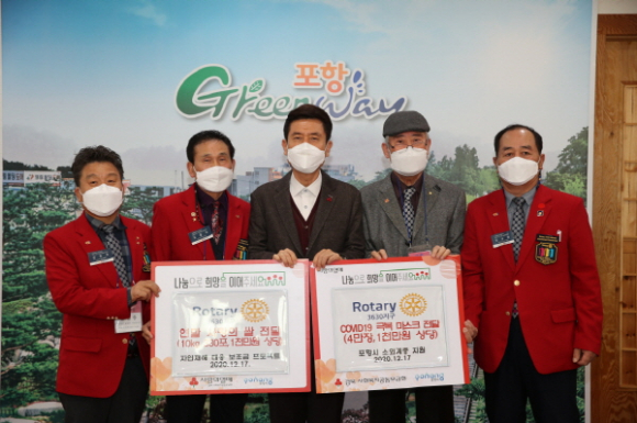 |  | | | ↑↑ 이강덕(가운데) 포항시장이 국제로타리3630지구 임원들과 기념사진을 촬영하고 있다. | | ⓒ GBN 경북방송 | | 국제로타리3630지구(총재 김상수)는 17일 코로나19 극복을 위한 마스크 4만 장과 연말 이웃돕기 사랑의 쌀 10kg 330포 등 총 2천만원 상당의 후원물품을 포항시에 기탁했다.