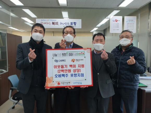 포항시 도성현 복지국장은 “코로나19로 모두가 힘든 시기이지만 이렇게 기부와 후원을 잊지 않는 기업체와 시민들 덕분에 지역사회 온기가 유지되고 있다.”며 OB맥주 문경철 포항지점장님께 감사인사를 전했다. |