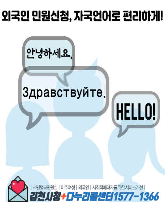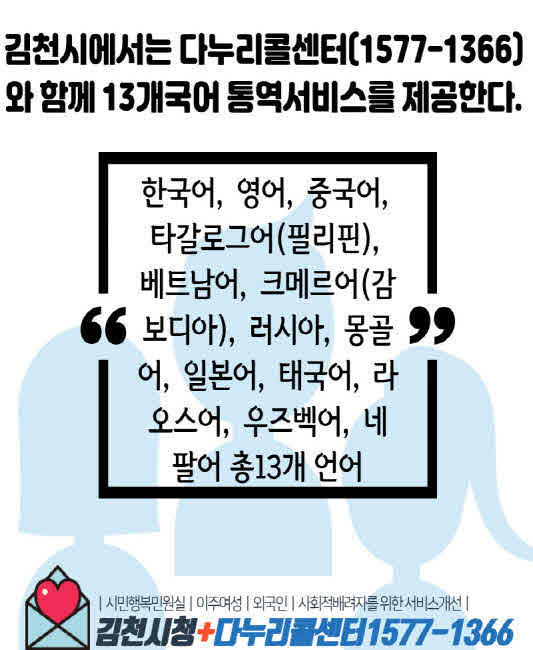 김천시(시장 김충섭)는 다누리콜센터(1577-1366)와 업무협조를 통해 통역서비스를 실시한다.