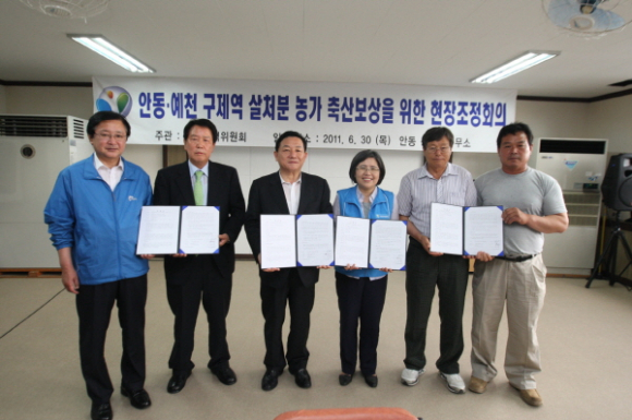 국민권익위는 30일 오후 2시 경북 안동시 풍천면사무소에서 김영재 경상북도개발공사 사장, 공원식 경상북도 정무부지사가 참여한 가운데 김영란 위원장 주재로 조정회의를 개최해 민원인들이 축산보상을 받을 수 있도록 하는 합의안을 성사시켜 민원을 해결했다.