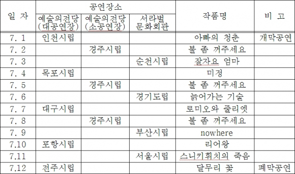 연극 페스티벌은 1일 인천시립극단의 '아빠의 청춘'을 시작으로 2일 경주시립극단의 '불 좀 꺼주세요', 7일 대구시립극단의 '로미오와 줄리엣', 12일 전주시립극단의 ‘달무리 꽃’ 등의 공연이 펼쳐진다.