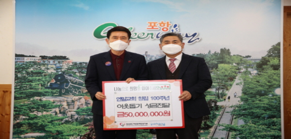이날 성금 전달식에는 김의환 담임목사를 비롯해 하규현 부목사, 양상수 장로 등 교회 관계자들이 참석하였으며, 2021.1.9. 포항연일교회 창립 100주년을 기념하여 지역사회 공헌활동의 일환으로 추진하는 것으로 그 의미를 더했다.