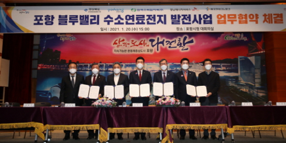 포항시는 20일 시청 대회의실에서 경상북도, 포항시, 한국수력원자력(주), 영남에너지서비스(주), (재)포항테크노파크 등 5개 기관이 수소산업 클러스터 조성과 연계한 ‘포항 블루밸리 수소연료전지 발전사업’의 성공적인 추진을 위하여 협약식을 가졌다.