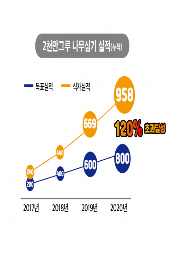 ▶ 4년(2017~2020) 누적목표 800만 그루 대비 119.8% 달성(958만 그루) ▶ 2020년 연간목표 200만 그루 대비 144.9% 달성(290만 그루)