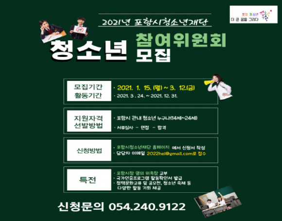 |  | | | ⓒ GBN 경북방송 | | 포항시청소년재단에서 포항시청소년참여위원회 위원을 오는 3월 12일까지 모집한다.