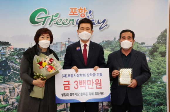 이강덕 포항시장, 이성관 영일대북부시장 상가번영회 회장 | | ⓒ GBN 경북방송 | | 포항시 영일대북부시장 등푸른막회지구가 24일 인재육성 장학금 300만 원을 포항시장학회에 기탁했다.
