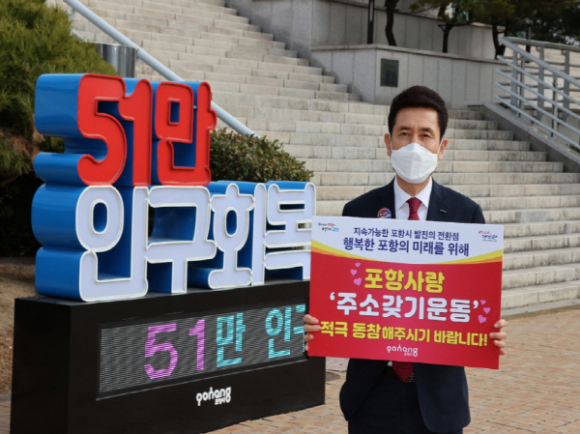 이강덕 포항시장은 “인구는 도시 경쟁력의 기초이자 지역발전의 동력으로 시민 모두가 함께 힘을 모은다면 연내 51만 인구회복도 충분히 달성할 수 있다”며, “내 고장, 내 직장 포항을 사랑하는 마음으로 주소갖기 운동에 적극 동참해 주시기를 당부드린다.”라고 말했다.