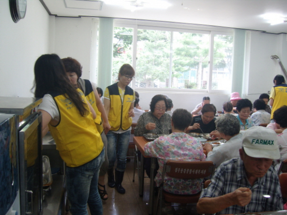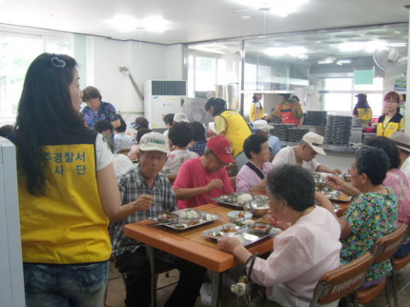 경주경찰서(서장 최병헌)는 북한이탈주민들이 국내에 들어와 달라진 환경에 조기적응 할 수 있는 계기 마련을 위해 2011. 7. 11 경주 용강복지관 무료급식소에서 북한이탈주민 등 20명이 참여 무의탁노인 등 200여명에게 무료급식 봉사활동을 실시했다.