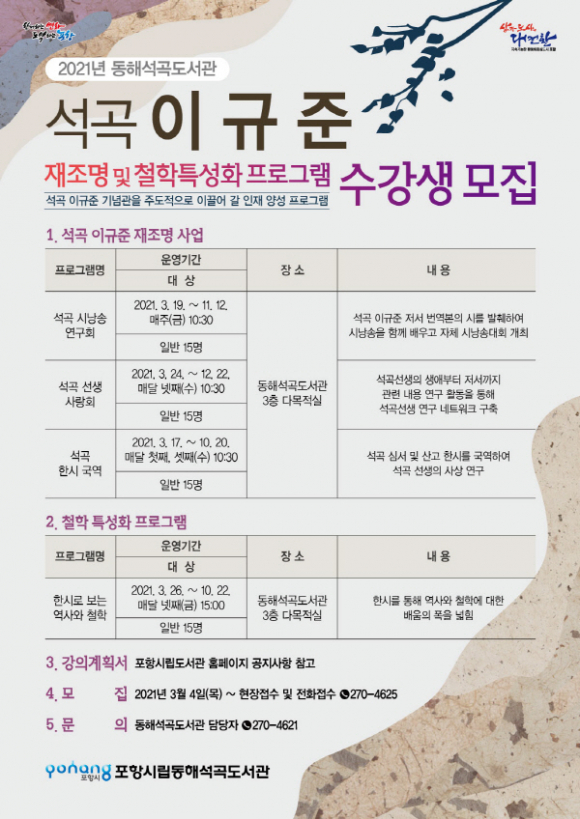 |  | | | ⓒ GBN 경북방송 | | 포항시립 동해석곡도서관은 지역 인물인 석곡 이규준의 사상과 업적, 작품을 널리 알리기 위하여 ‘석곡 이규준 재조명 강좌’를 진행한다. 성인을 대상으로 총 3개 강좌를 개설하여 4일부터 현장 및 전화접수를 통해 수강생을 모집한다.
