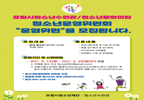 |  | | | ⓒ GBN 경북방송 | | 포항시청소년재단 내 포항시청소년수련관, 청소년문화의 집에서는 2021년 청소년 활동 프로그램 활성화 사업을 기획하는 ‘포항시 청소년 운영위원’을 오는 3월 15일(월)부터 3월 22일(월)까지 모집한다. 청소년 운영위원회는 △지역 청소년수련시설 프로그램 운영 및 시설 모니터링 △정기회의(매월) 및 임시회의 △타기관과의 교류활동 △ 문화행사 기획 및 운영활동 등의 활동을 희망하는 관내 청소년(9세~24세)이면 누구나 신청이 가능하다.