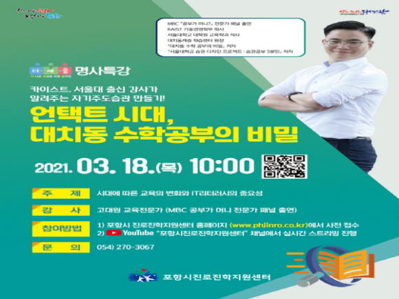 포항시는 오는 18일 교육전문가 고대원 명사를 초청해 ‘언택트 시대, 대치동 수학공부의 비밀’ 특강을 개최한다고 밝혔다.