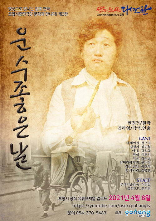 포항시립연극단은 코로나19 종식 이후에도 오프라인은 물론, 온라인을 통해 꾸준히 관객과의 교류를 가질 예정이며, 2021년 처음으로 찾아가는 시립연극단의 집콕 연극으로 한국 단편 소설을 보다 쉽고 재미있게 접할 수 있기를 기대해 본다. |  | | | ↑↑ 운수좋은날 포스터 | | ⓒ GBN 경북방송 | |