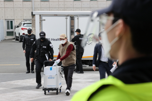 정부가 화이자사(社)와 계약한 백신 1천300만명 분 가운데 고령층 접종용 25만 명분이 24일 오전 인천국제공항 화물터미널에 우선 도착, 군사경찰과 군의 경호 속에서 백신 이송 차량으로 옮겨졌다.