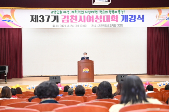 김천시평생교육원에서는 3월 24일(수) 10시 교육원 대강당에서 김충섭 시장, 이우청 의회의장, 총동창회(회장 서지선) 임원, 여성대학 수강생 등 100여명이 참석한 가운데 「2021년 제37기 김천시여성대학」개강식을 가졌다. 역사와 전통을 자랑하는 김천시여성대학은 여성들의 잠재된 능력을 개발하고 지역사회 발전을 주도할 유능한 여성인재를 발굴·육성하고 있으며, 지난 해 코로나19로 운영하지 못한 아쉬움과 함께 뜨거운 열기 속에 개강하게 되었다. 올해 운영되는 제37기 여성대학은 여성리더가 갖춰야 할 교양, 건강, 문화, 예술 등을 주제로 5월까지 매주 2회(수, 금) 2시간씩 운영하게 된다. 개강식에 참석한 수강생들의 얼굴에 웃음꽃이 만연한 가운데 서로 환영의 인사와 여성대학을 통한 평생학습의 기쁨을 누렸으며, 시에서 추진하고 있는‘해피투게더 김천운동’실천 다짐대회와 퍼포먼스를 통해 시민으로서의 자긍심과 자부심을 가지는 시간도 가졌다. 개강식에 이어 이현주 강사의 ‘유쾌한 화합을 만드는 고품격 소통리더십’주제의 첫 강의를 시작으로 여성대학 일정을 힘차게 출발했다.