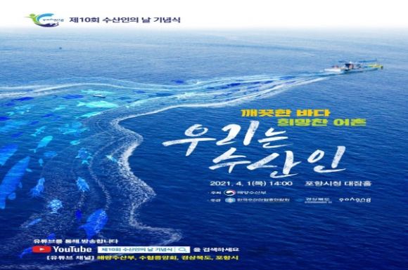 |  | | | ↑↑ 홍보 포스터 | | ⓒ GBN 경북방송 | | 포항시는 오는 4월 1일 포항시청 대잠홀에서 수산업과 어촌의 소중함을 알리고 수산인의 긍지와 자부심 고취하기 위해 제10회 수산인의 날 기념식을 개최한다.