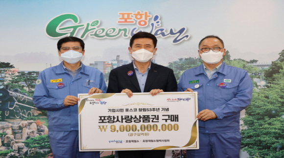 |  | | | ↑↑ 왼쪽부터 남수희 포항제철소장, 이강덕 포항시장, 김헌덕 포항제철소협력사협회장 | | ⓒ GBN 경북방송 | | 포스코 포항제철소와 포항제철소협력사가 오는 4월 1일 포스코 창립 53주년을 맞아 포항사랑상품권을 구입해 ‘쓸수록 커지는 특별한 지역사랑’을 실천했다.