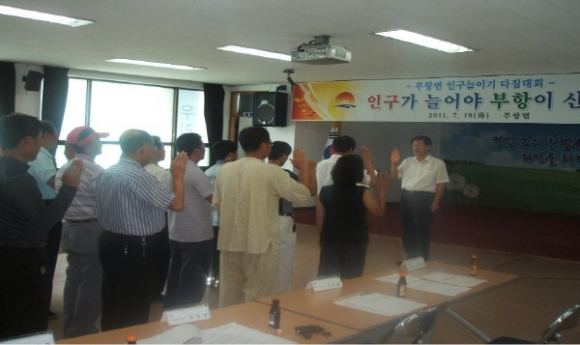김천시 부항면(면장 나영배)에서는 지난 19일 면사무소 회의실에서 “인구가 늘어야 부항이 산다.”라는 슬로건을 걸고 인구증가 다짐대회를 개최했다.