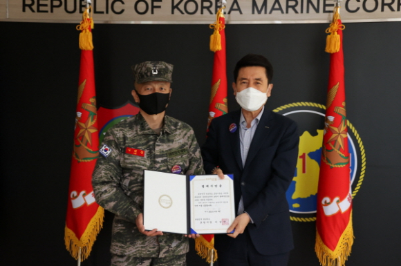 이강덕 포항시장은 9일 해병대 제1사단을 방문하여 김태성 신임 해병대사령관 내정자에게 명예시민증과 감사패를 수여했다.