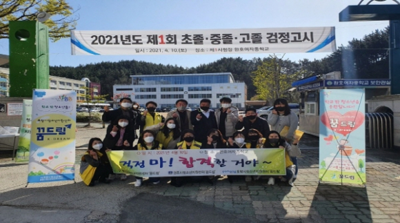 포항시청소년재단 내 학교밖청소년지원센터(이하 꿈드림센터)는 지난 10일 2021년도 제1차 초·중·고졸 검정고시 시험장(포항환호여자중학교)에서 합격 기원을 위한 응원 활동을 진행했다.