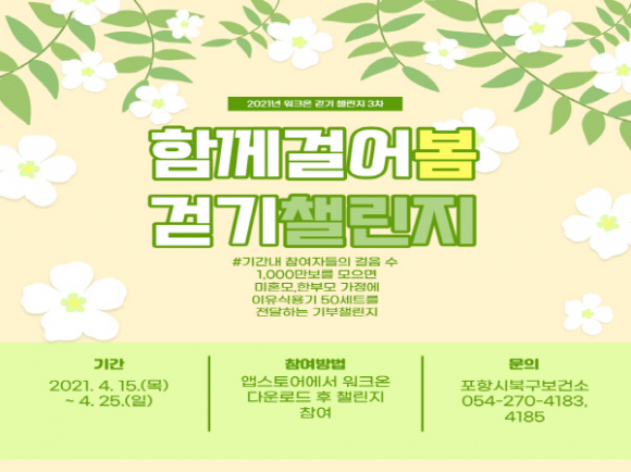 |  | | | ⓒ GBN 경북방송 | | 포항시는 스마트폰 걷기 앱 ‘워크온(Walk on)’을 사용하는 시민을 대상으로 ‘함께걸어봄 챌린지’를 15일부터 25일까지 진행한다.