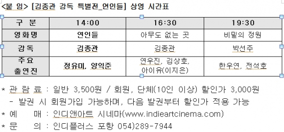 이번 특별전은 지금은 접하기 힘든 김종관 감독의 2000년 대 초반 단편작품을 스크린으로 감상할 수 있는 기회로서, 그의 섬세한 스토리텔링으로 단편영화만의 미학을 느낄 수 있는 김감독 초기 단편영화 11편을 묶은 옴니버스 ‘연인들’이 상영된다. 기획전 상영 이후에도 감독의 신작 ‘아무도 없는 곳’ 관람이 가능하다.