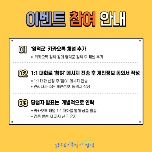 영덕군이 카카오톡 채널을 영덕군 대표 소통 채널로 만들기 위해 가입자 이벤트를 실시한다. 채널에 가입 한 사람 중 무작위로 100명을 추첨해 5천원 상당의 기프트콘을 지급한다. 참가 방법은 간단하다. 카카오톡 검색창에 ‘영덕군’을 검색 한 후 채널을 추가한 뒤 1대1 대화로 ‘참여’라는 메시지를 보내면 된다. 이후 관리자가 주는 개인정보 동의서를 작성만 하면 참가가 완료된다. 이벤트는 5월7일까지 진행되며, 추첨된 사람에게 5월17일 카카오톡 채널 1대1 대화로 일괄 발송한다.