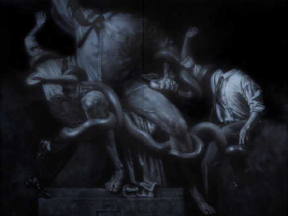 심윤 작가는 사람에 대한 관심을 회화로 표현하며 수집된 이미지를 대형 캔버스에 재현하는 작업을 보여준다. 그는 이 시대를 살아가는 현대인의 모습을 색채가 배제된 무채색을 사용해 커다란 화면 속에 과장되고 역설된 장면들을 담아낸다. 하이퍼리얼리즘 스타일을 통해 현대인의 모습을 투쟁적으로 그려낸 대형 인물 작업은 관람객의 시선을 압도한다.
