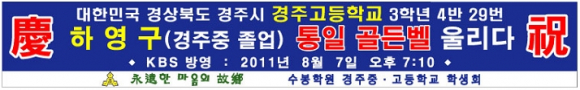 골든벨을 울린 하영구 학생은 전국최강전(왕중왕전) 최종 1인자에서 골든벨 명예의 전당에 등록되고 부상으로는 대통령상, 대학입학등록금, 미국4주간 어학연수(문화체험), 해외배낭여행 연수비 경주고등학교에 LED-TV (5대 지원) 2011년 8월 7일 오후 7시10분부터 TV에 방송 된다. |