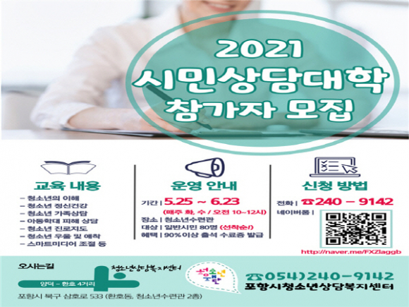 |  | | | ⓒ GBN 경북방송 | | 포항시청소년상담복지센터는 청소년의 달 5월을 맞아 일반시민 80명을 대상으로 운영되는 ‘2021 시민상담대학’ 참가자를 5월 21일까지 선착순 모집해 코로나19 사회적 거리두기 지침을 준수하며 운영할 예정이다.