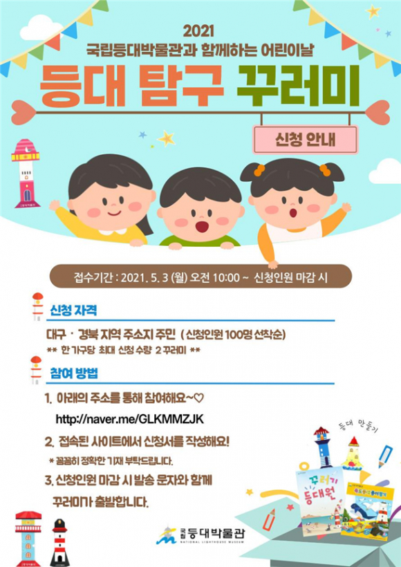 한국항로표지기술원(원장 박계각) 소속 국립등대박물관에서는 어린이날을 맞아 사회적 거리두기가 지속되고 있는 가운데 대구·경북 지역민 대상 어린이날 이벤트를 5월 3일 부터 실시한다고 밝혔다.