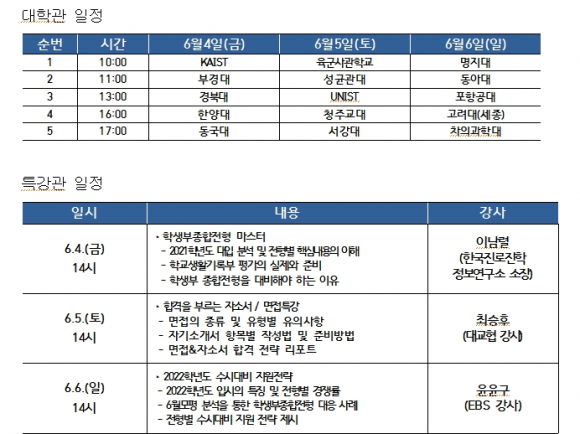 △6월 5일(토)에는 자타공인 최고의 입시전문가로 알려진 한국대학교육협의회 소속 대표강사 최승후 강사를 초청해 자기소개서 항목별, 면접 유형별 준비방법 등 다양한 입시제도에 도움이 될 ‘합격을 부르는 자소서/면접특강’을 제공한다.