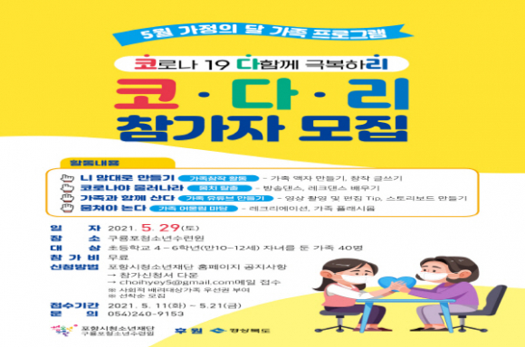 |  | | | ↑↑ 코다리 가족캠프 모집 포스터 | | ⓒ GBN 경북방송 | | 포항시 구룡포청소년수련원은 29일에 실시하는 코·다·리(코로나 블루 다함께 극복하리) 가족 캠프 참가 가족을 11일부터 21일까지 모집한다.