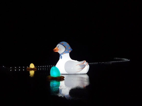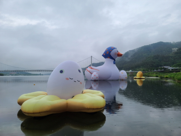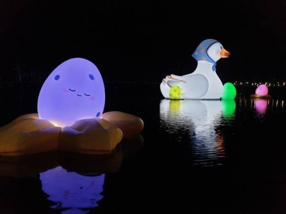 5월 15일부터 6월 13일까지 한 달간 선보이는 이번 전시에는 길이 19.5m, 높이 16.2m 규모의 슈퍼 오리와 오리알 4개가 전시되며, 경관조명을 설치하여 야간에도 아름다운 경관을 즐길 수 있다.
