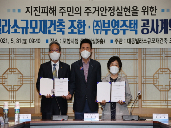이날 이강덕 포항시장이 참석한 가운데, 최양환 ㈜부영주택 대표이사, 정영희 대동빌라 소규모재건축정비사업 조합장은 시청 중회의실에서 계약을 체결하고 연내에 착공하기로 합의했다.