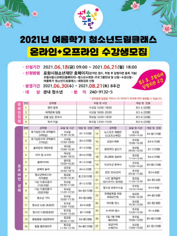 포항시청소년재단 윤영란 상임이사는 “학교를 벗어난 학교 밖 청소년들이 다양한 경험을 습득해 자신감을 가지고 건강하게 성장 할 수 있도록 다양한 프로그램 운영을 위해 적극 지원하겠다”라고 전했다.