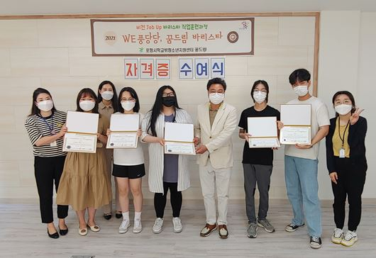 포항시청소년재단 학교밖청소년지원센터(이하 꿈드림센터)는 지난 9일 학교 밖 청소년 바리스타 직업훈련과정 교육 후, 필기·실기시험에 합격한 청소년을 대상으로 자격증을 수여했다.