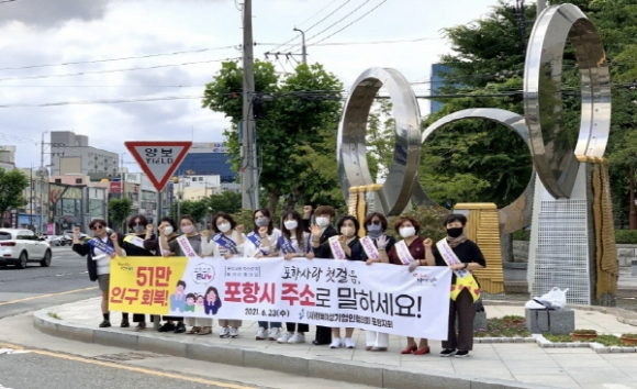 |  | | | ⓒ GBN 경북방송 | | 경상북도 여성기업인협의회 포항지회는 23일 회원들과 함께 한국은행 앞 교차로에서 51만 인구회복을 위한 ‘포항사랑 주소갖기 운동’ 캠페인을 펼쳤다.