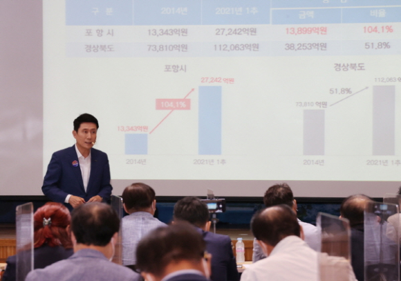 특히, 미래 신성장산업 동력 구축은 물론, 대형SOC․공모사업 등 현안 사업의 적극적인 발굴과 꾸준한 국․도비 확보 노력을 통해 2014년 1조3343억 원이었던 포항시 예산이 7년 만인 올해 104.1% 증가된 2조7242억 원(1회 추경예산 기준)을 편성하며 서민생활 안정과 지역 경제에 활력을 불어넣고 있다.